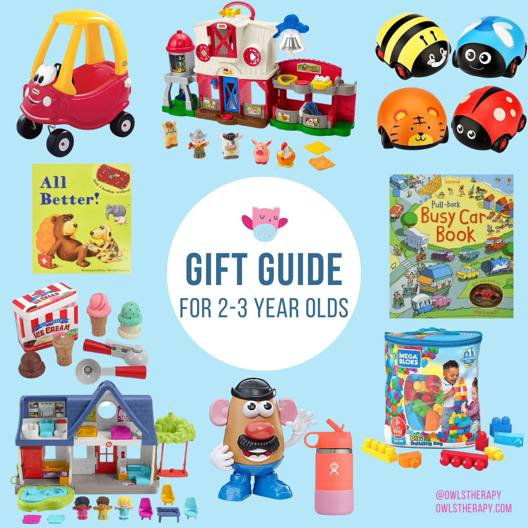 Today’s blog post features our 2-3-year-old gift guide. Another huge language growth occurs during this period of life. At 2, toddlers should be around 50% intelligible, adding new words frequently to their vocabulary, and combining words together. By 3, toddlers use pronouns (you, I, me, she, he, they), answer and ask a variety of questions, and begin to use plurals (i.e. “shoes”) and past tense (i.e. “jumped”). A 3-year-old is expected to be around 75% intelligible and have the speech sounds /p, b, b, d, n, h, t, k, g, w, ng, f, y/ mastered.