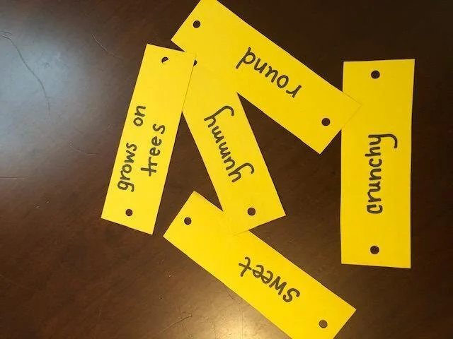 While this is optonal, this is the best part in my speech pathologist brain…write on your strips either artculaton words your child is working on in speech (ex. words that begin with L, words that end in SH, etc) or have your child help brainstorm fall words, words that describe an apple or pumpkin, etc. (Hello vocabulary development and categorizaton skills!) If you are having difculty with this step, ask your child’s speech pathologist, she will have plenty of ideas of words that can go on the strips!