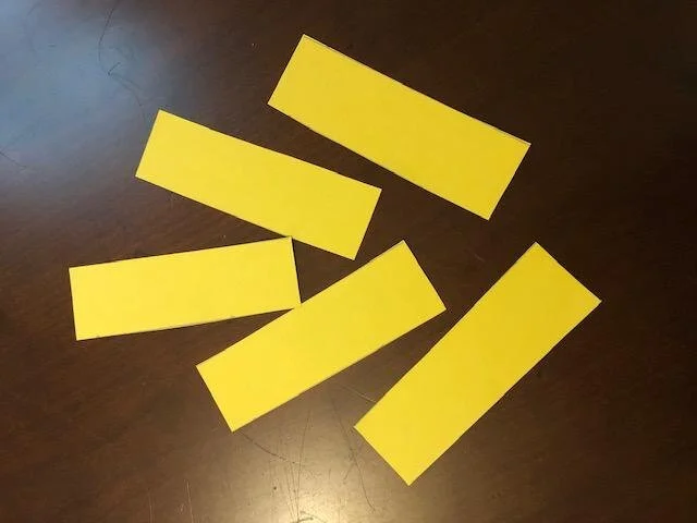 Chose which fruit (yes, pumpkins are a fruit since they are from the seed of a fowering plant!) you are going to make and it’s corresponding paper. I will be making a Golden Delicious for this demo and have thus selected yellow constructon paper. Cut the paper into an 8.5 inch by 5.5 inch rectangle. Using the ruler, mark a line every 1.75 inches across the long edge of the paper for a total of 5 segments on your rectangle. Do this at the top and botom and then draw a line to connect the marks. (I typically always have this step complete when I am doing this project with my students, but depending on the age, this is not necessary.)