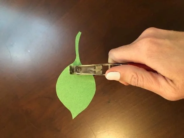 Cut out the leaf and then hole punch the leaf by the base of the stem. Make sure to leave enough room so that the leaf won’t be ripped of.