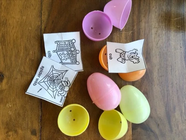 5. Word groups: If your child is working on reading various word groups, eggs can be a quick way to target them. This does require you to write on the egg so if you wanted to use them again next year, this might not be the activity for you. On the top half of the egg, write the word group (ex. -at, -it, -ag, -ack, -ick, etc). On the bottom half, right the first letter of that goes with that word group. If you happen to make a word that doesn’t exist, that is okay! Ask the child when they read it if that is a real word or not! This is a good skill to develop as we want to make sure they are actually paying attention to what they are reading! My only hint, make sure it doesn’t make a word that you DON’T want them reading!!