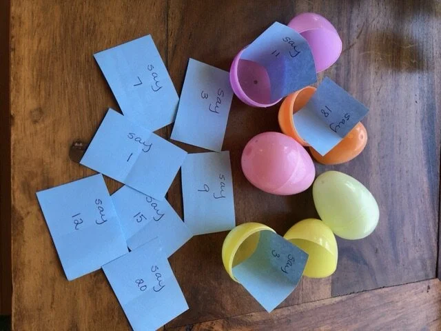 1. Following directions: I like to hide the eggs around the room (where they are not visible at all) and then give the child directions based on their goals…vocabulary, prepositions, multi-step directions…can all be targeted with Easter eggs. For example, “After you do 5 bunny hops, look under the thing you sit on.” In this one direction, we targeted multiple steps (hoping like a bunny and looking under something), counting (only do 5 hops, not 4, not 6!), beginning inferencing/vocabulary development by using the cue of what does one sit on versus saying “chair,” conjunctions with the word “after,” and lastly, prepositions with the word “under.” Now, this direction could be too much for some children, but as you can see, it would be easy to take away parts or add even more if needed!
