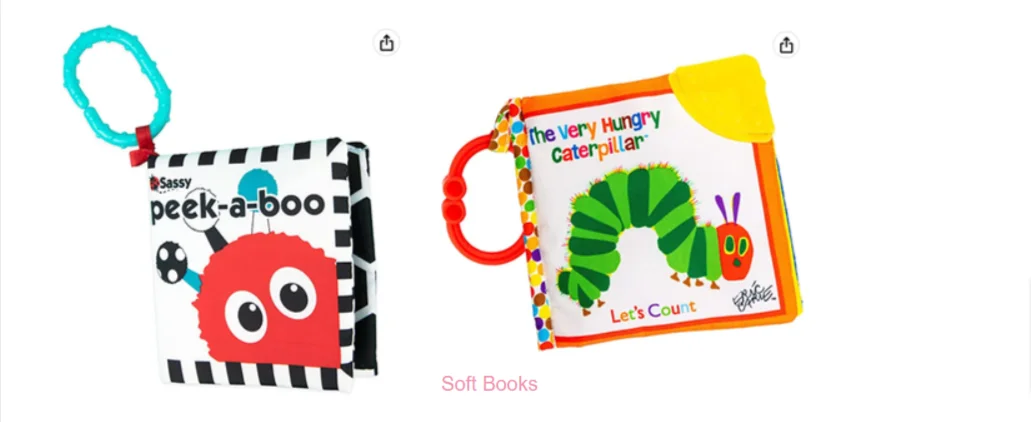 Toys should encourage tummy time and social awareness, teach stacking, object permanence, special relations, and use of both sides of the brain, and promote overall speech, language and memory development. Toys can include mirrors for tummy time, crinkle and sensory toys to explore the world around them, and black and white images to stimulate the optic nerves. Here are some of our favorite toys for early development: