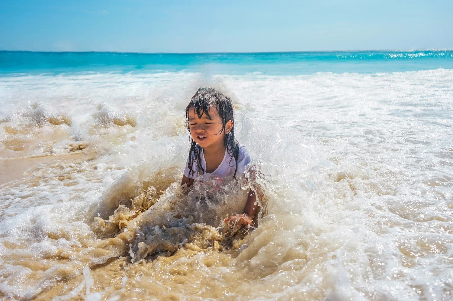 The beach offers a variety of sensory experiences. Describe how the sand and water feel using adjectives! Cold, slimy, soft, hot, etc.